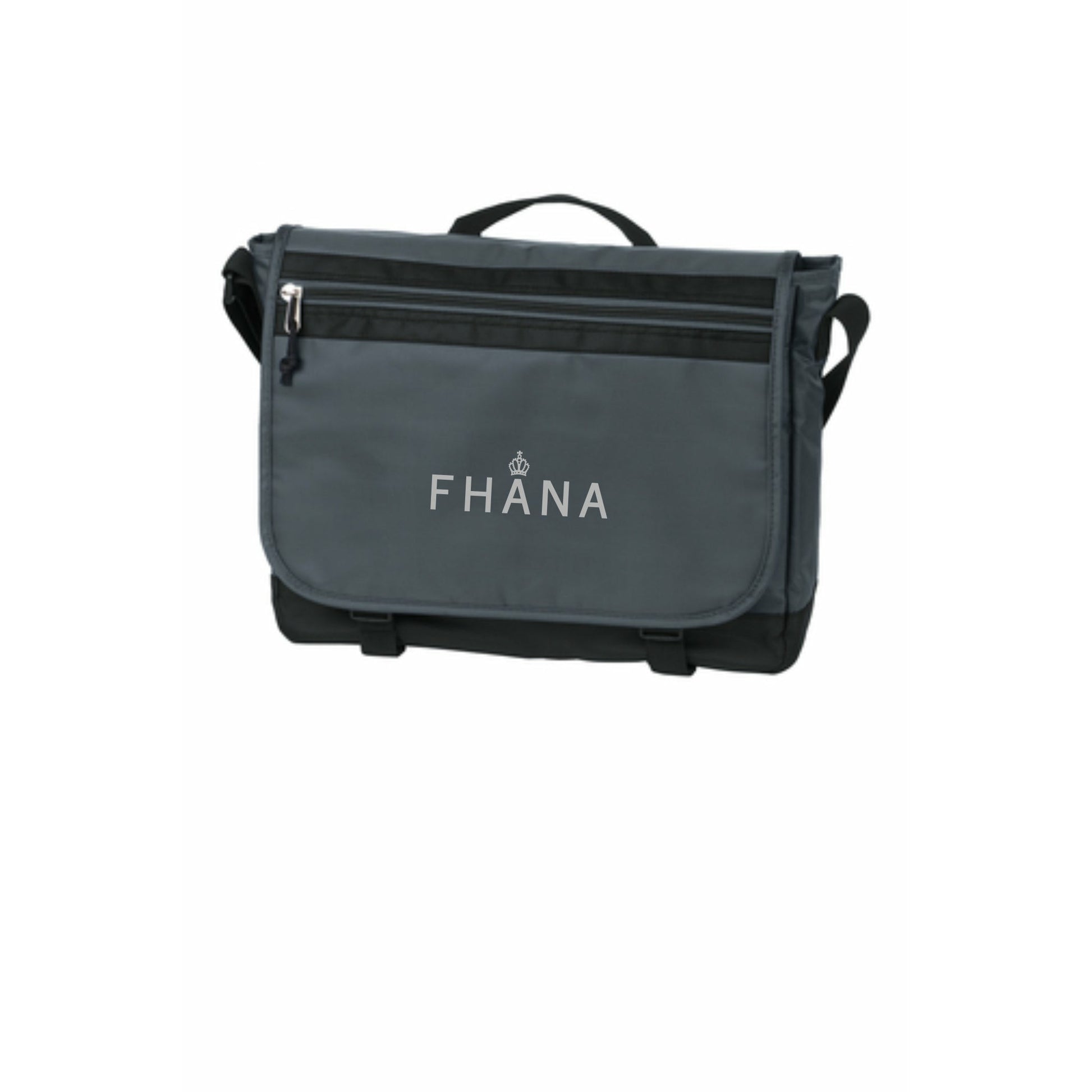 This two-tone, subtly textured messenger takes good care of your tech essentials and keeps things organized when you're on the go. It has a large main compartment with padded laptop and tablet sleeves with dual buckle closure keeps contents secure and an adjustable sling shoulder strap. The FHANA logo is embroidered on the front.